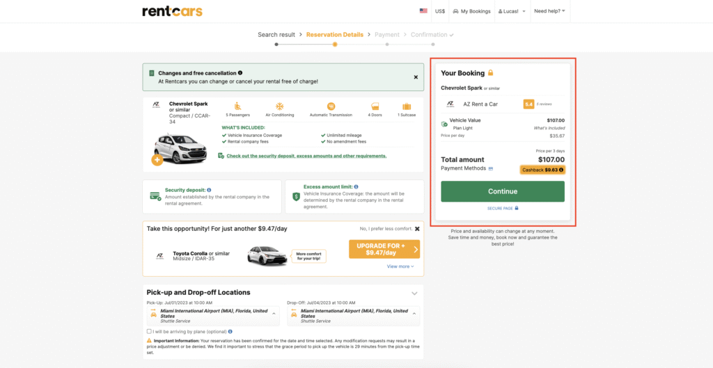 Don’t forget to check the booking details for your rental! Make sure this is the right category, your preferred rental company and that you have added the insurance and optional items you need.