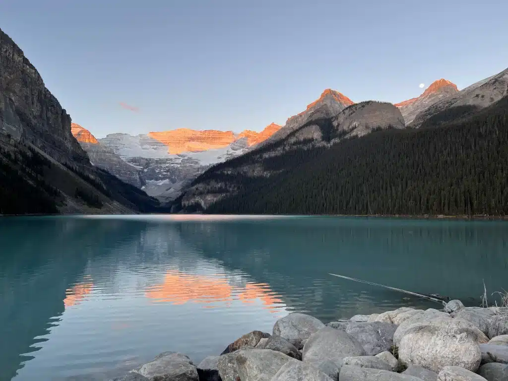 A principal parada do roteiro nesse dia foi o Lake Louise, o cartão-postal das Montanhas Rochosas. Com águas azul-turquesa cercadas por picos nevados, o lugar é perfeito para uma caminhada mais leve ou quem quer passar um tempo admirando a paisagem natural.