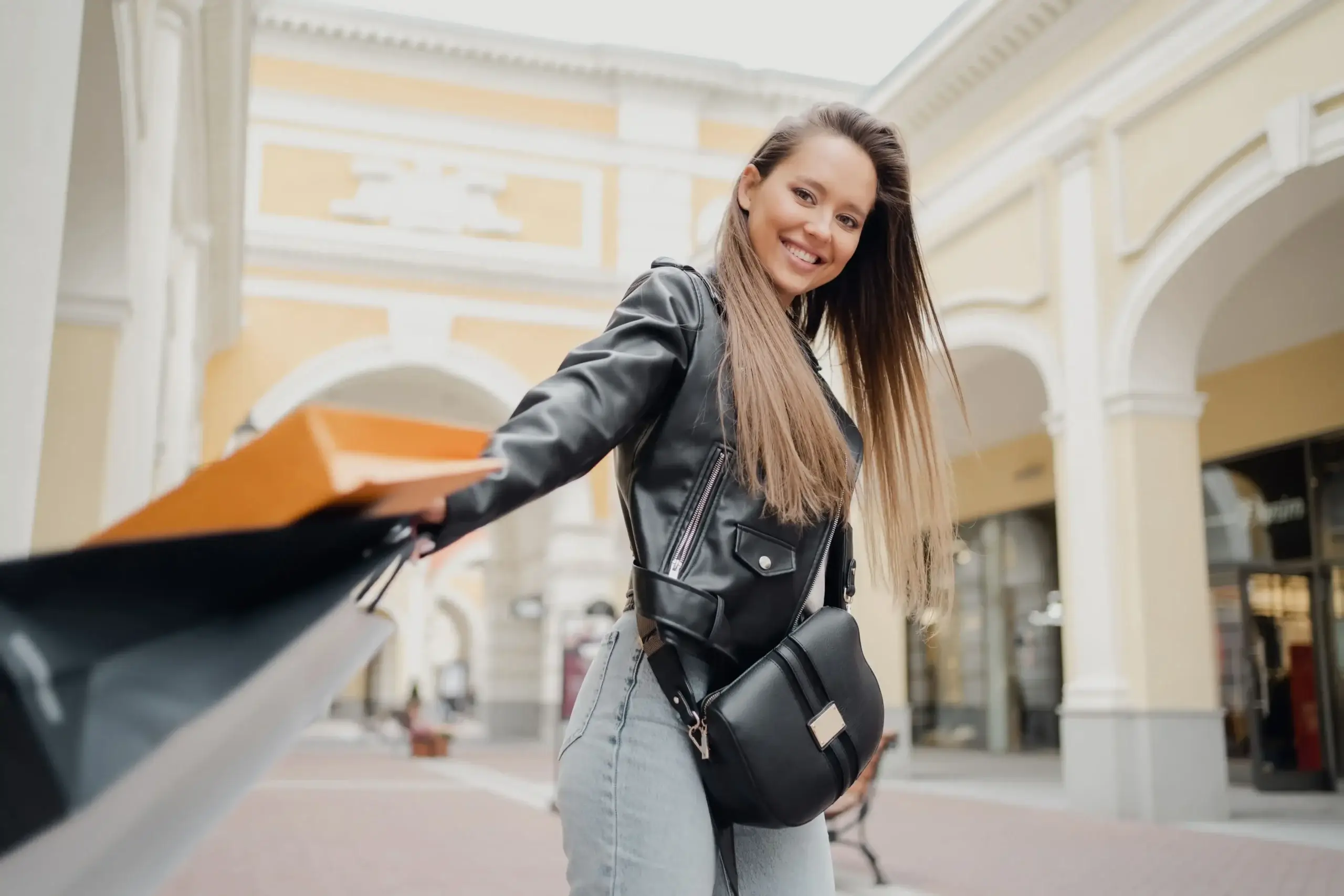 Foto de uma mulher sorridente olhando para câmera. Ela está segurando sacolas de compras e está dentro de um estabelecimento estilo shopping.